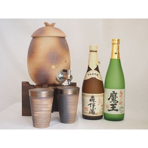 信楽焼・明山窯 焼酎サーバー 火色金小紋 2200cc(滋賀県)+萬古焼・備前金彩焼酎ペアカップ(三重県)+芋焼酎 魔王 森伊蔵 720ml