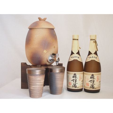 信楽焼・明山窯 焼酎サーバー 火色金小紋 2200cc(滋賀県)+萬古焼・備前金彩焼酎ペアカップ(三重県)+芋焼酎 森伊蔵 720ml×2本(鹿児島県)