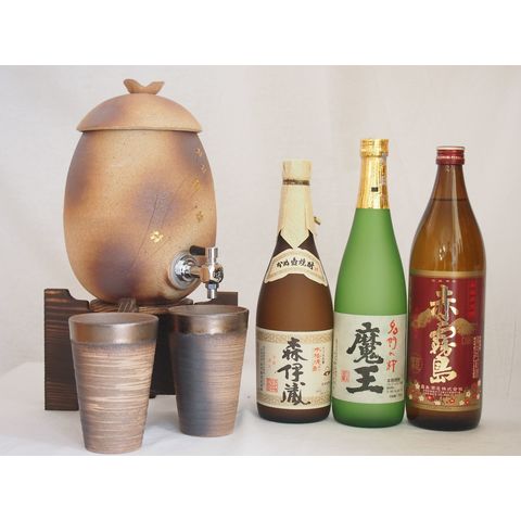信楽焼・明山窯 焼酎サーバー 火色金小紋 2200cc(滋賀県)+萬古焼・備前金彩焼酎ペアカップ(三重県)+芋焼酎 魔王 森伊蔵 720ml 赤霧島 900ml