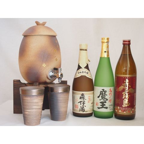 信楽焼・明山窯 焼酎サーバー 火色金小紋 2200cc(滋賀県)+萬古焼・備前金彩焼酎ペアカップ(三重県)+芋焼酎 魔王 森伊蔵 720ml 赤霧島 900ml