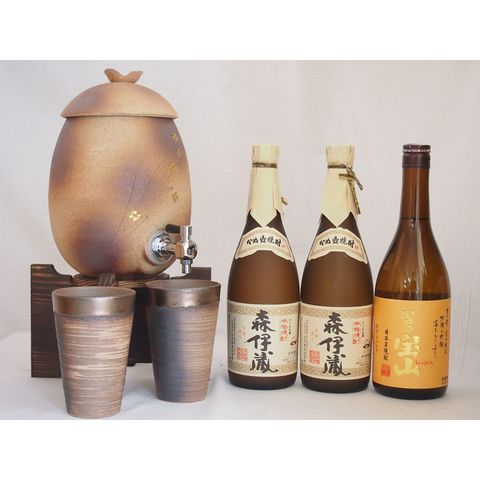 信楽焼・明山窯 焼酎サーバー 火色金小紋 2200cc(滋賀県)+萬古焼・備前金彩焼酎ペアカップ(三重県)+芋焼酎 富乃宝山 森伊蔵2本 720ml