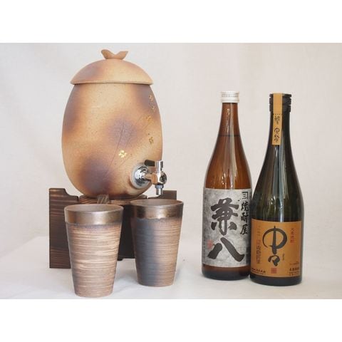 信楽焼・明山窯 焼酎サーバー 火色金小紋 2200cc(滋賀県)+萬古焼・備前金彩焼酎ペアカップ(三重県)+芋焼酎 兼八 中々 720ml