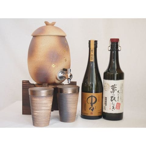 信楽焼・明山窯 焼酎サーバー 火色金小紋 2200cc(滋賀県)+萬古焼・備前金彩焼酎ペアカップ(三重県)+芋焼酎 中々 麦焼酎 5年長期熟成夢のひととき 720ml