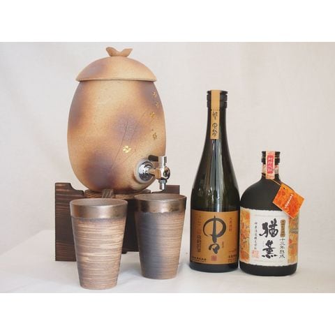 信楽焼・明山窯 焼酎サーバー 火色金小紋 2200cc(滋賀県)+萬古焼・備前金彩焼酎ペアカップ(三重県)+芋焼酎 中々 猶薫 720ml