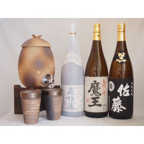 信楽焼・明山窯 焼酎サーバー 火色金小紋 2200cc(滋賀県)+萬古焼・備前金彩焼酎ペアカップ(三重県)+芋焼酎 佐藤黒 魔王 森伊蔵 1800ml