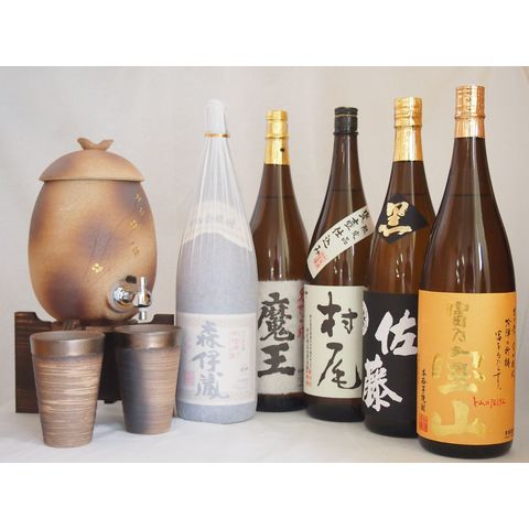 信楽焼・明山窯 焼酎サーバー 火色金小紋 2200cc(滋賀県)+萬古焼・備前金彩焼酎ペアカップ(三重県)+芋焼酎 佐藤黒 富乃宝山 魔王 森伊蔵 村尾 1800ml