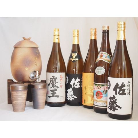 信楽焼・明山窯 焼酎サーバー 火色金小紋 2200cc(滋賀県)+萬古焼・備前金彩焼酎ペアカップ(三重県)+芋焼酎 佐藤黒 富乃宝山 佐藤白 伊佐美 魔王 1800ml
