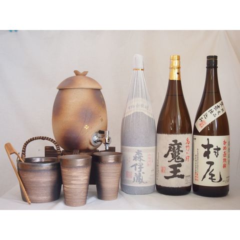 信楽焼・明山窯 焼酎サーバー 火色金小紋 2200cc(滋賀県)+萬古焼・備前金彩焼酎ペアカップ 氷入れ(三重県)+芋焼酎 魔王 森伊蔵 村尾 1800ml
