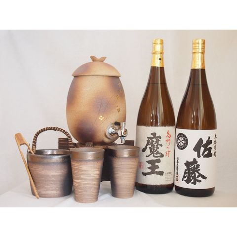 信楽焼・明山窯 焼酎サーバー 火色金小紋 2200cc(滋賀県)+萬古焼・備前金彩焼酎ペアカップ 氷入れ(三重県)+芋焼酎 佐藤白 魔王 1800ml
