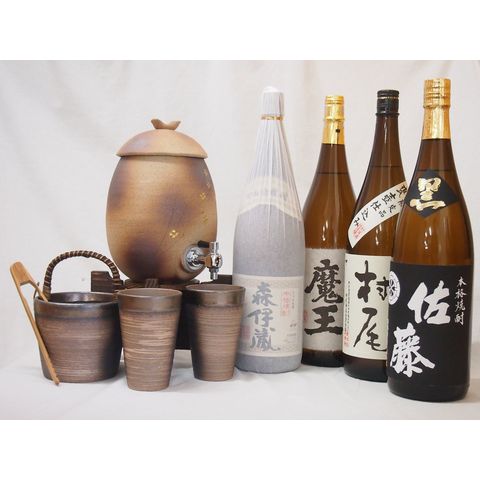 信楽焼・明山窯 焼酎サーバー 火色金小紋 2200cc(滋賀県)+萬古焼・備前金彩焼酎ペアカップ 氷入れ(三重県)+芋焼酎 森伊蔵 村尾 佐藤黒 魔王 1800ml