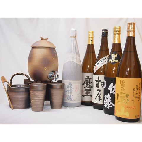 信楽焼・明山窯 焼酎サーバー 火色金小紋 2200cc(滋賀県)+萬古焼・備前金彩焼酎ペアカップ 氷入れ(三重県)+芋焼酎 森伊蔵 村尾 佐藤黒 富乃宝山 魔王 1800ml
