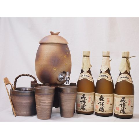 信楽焼・明山窯 焼酎サーバー 火色金小紋 2200cc(滋賀県)+萬古焼・備前金彩焼酎ペアカップ 氷入れ(三重県)+ 3本セット芋焼酎 森伊蔵 720ml(鹿児島県)