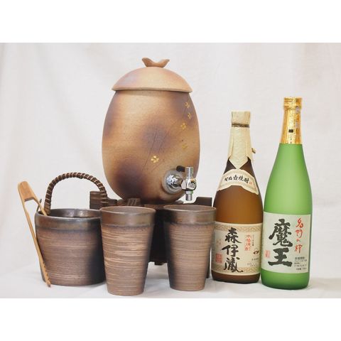信楽焼・明山窯 焼酎サーバー 火色金小紋 2200cc(滋賀県)+萬古焼・備前金彩焼酎ペアカップ 氷入れ(三重県)+芋焼酎 森伊蔵 魔王 720ml