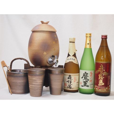 信楽焼・明山窯 焼酎サーバー 火色金小紋 2200cc(滋賀県)+萬古焼・備前金彩焼酎ペアカップ 氷入れ(三重県)+芋焼酎 森伊蔵 魔王 720ml 赤霧島 900ml