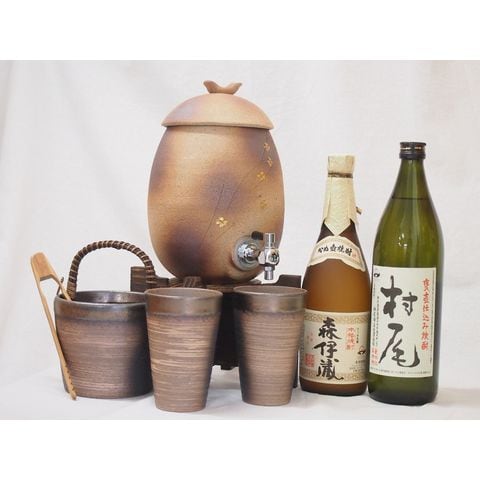 信楽焼・明山窯 焼酎サーバー 火色金小紋 2200cc(滋賀県)+萬古焼・備前金彩焼酎ペアカップ 氷入れ(三重県)+芋焼酎 森伊蔵 720ml 村尾 900ml