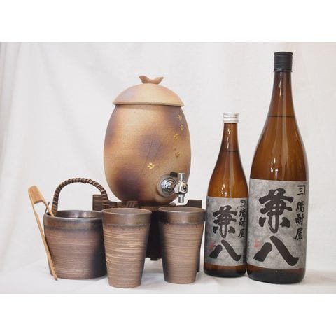 信楽焼・明山窯 焼酎サーバー 火色金小紋 2200cc(滋賀県)+萬古焼・備前金彩焼酎ペアカップ 氷入れ(三重県)+芋焼酎 四ツ谷酒造 兼八 720ml 1800ml(大分県)