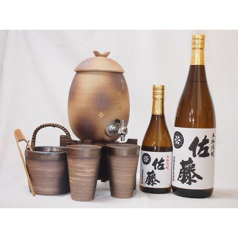 信楽焼・明山窯 焼酎サーバー 火色金小紋 2200cc(滋賀県)+萬古焼・備前金彩焼酎ペアカップ 氷入れ(三重県)+芋焼酎 佐藤 白 720ml 1800ml(鹿児島県)