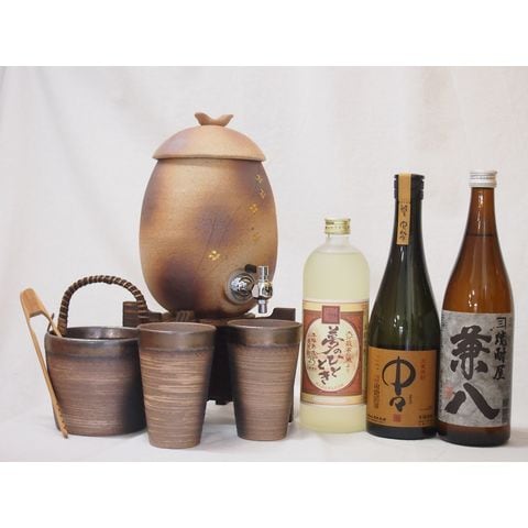 信楽焼・明山窯 焼酎サーバー 火色金小紋 2200cc(滋賀県)+萬古焼・備前金彩焼酎ペアカップ 氷入れ(三重県)+麦焼酎 芋焼酎 夢のひととき 中々兼八 720ml