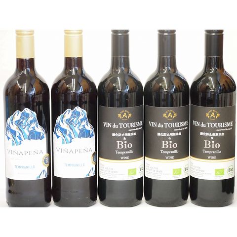 スペイン特集赤ワイン5本セット(ヴァンドゥツーリズム酸化防止剤無添加&Bioテンプラニーリョ赤 ヴィニャペーニャ赤ライトボディ) 750ml×5本