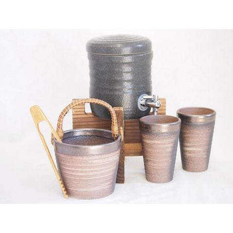 国産美濃焼 天正黒釉焼酎サーバー豪華1200cc木代付セット(13.5×15.5cm 1.6キロ)+萬古焼・備前金彩焼酎ペアカップ 氷入れ(三重県)