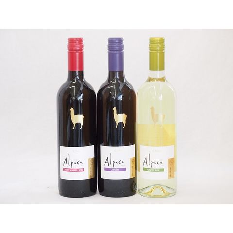 チリ産ワインアルパカ3本セット(赤カルメネール(フルボディ) 赤カベルネ・メルロー(ミディアムボディ) 白ソーヴィニヨン・ブラン(辛口)) 750ml×3本