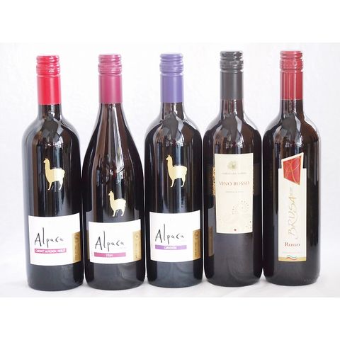チリ産アルパカとイタリア赤ワイン5本セット(赤シラー 赤カルメネール 赤カベルネ・メルロー 赤コルテ デル ニッピオ ロッソ 赤ブルーサ ロッソ) 750ml×5本