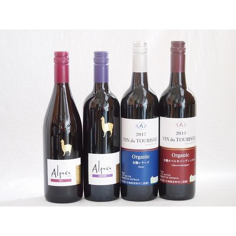 チリ産アルパカとオーストラリア産オーガニックワイン4本セット(赤シラー 赤カルメネール 赤ヴァンドゥツーリズム有機シラーズ 赤ヴァンドゥツーリズム有機カベルネソーヴィニヨン) 750ml×4本