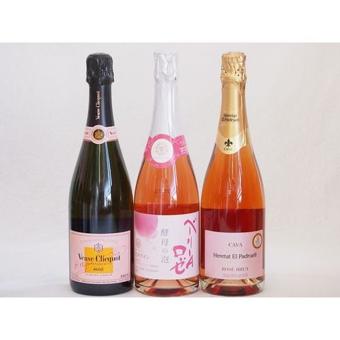 果実味豊かなロゼスパークリングワイン3本セット(シャンパーニュ製法エレタットロゼ(スペイン) ヴーヴ クリコ ロゼ ローズラベル 酵母の泡ベーリーAロゼ やや辛口) 750ml×2本 720ml×1本