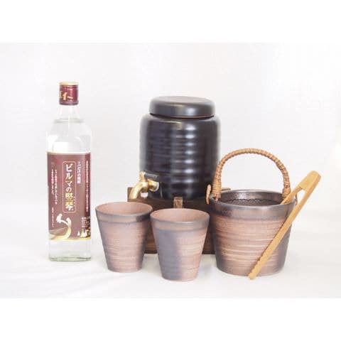 本格焼酎サーバー1000cc(18cm×24cm 1kg)萬古焼ペアカップ氷入れ竹トングセット ソバだけのそば焼酎 ビルマの竪琴 (ミャンマー) 700ml×1本