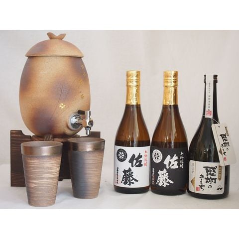 信楽焼・明山窯 焼酎サーバー 火色金小紋 2200cc(滋賀県)+萬古焼・備前金彩焼酎ペアカップ(三重県)+芋焼酎 佐藤黒 佐藤白 感謝のきもち 720ml