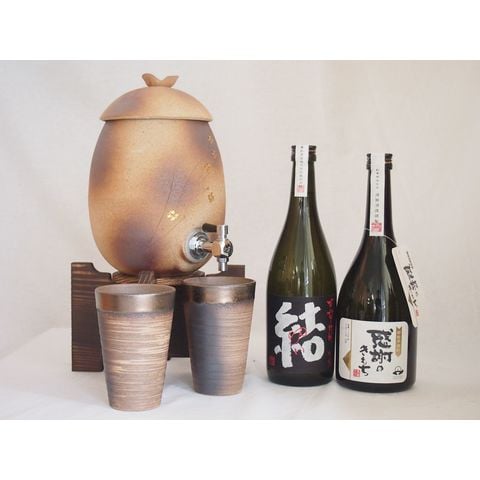 信楽焼・明山窯 焼酎サーバー 火色金小紋 2200cc(滋賀県)+萬古焼・備前金彩焼酎ペアカップ(三重県)+芋焼酎 結 感謝の気持ち 720ml