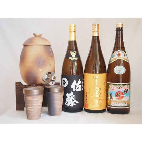 信楽焼・明山窯 焼酎サーバー 火色金小紋 2200cc(滋賀県)+萬古焼・備前金彩焼酎ペアカップ(三重県)+芋焼酎 佐藤黒 富乃宝山 伊佐美 1800ml