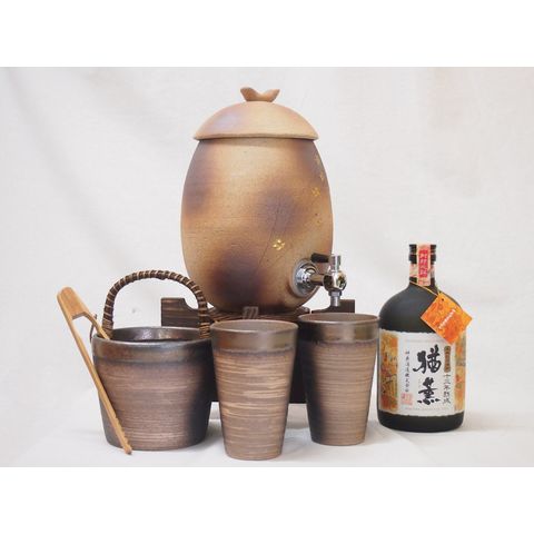 信楽焼・明山窯 焼酎サーバー 火色金小紋 2200cc(滋賀県)+萬古焼・備前金彩焼酎ペアカップ 氷入れ(三重県)+麦焼酎 神楽酒造 猶薫 (なおしげ) 720ml(宮崎県)