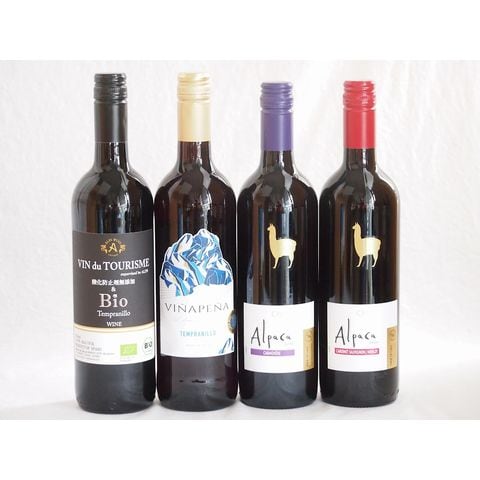 スペイン×チリ赤ワイン4本セット(ヴァンドゥツーリズム酸化防止剤無添加&Bioテンプラニーリョ(スペイン) ヴィニャペーニャ ライトボディ(スペイン) アルパカカルメネール(チリ) アルパカカベルネ・メルロー) 750ml×4本