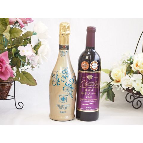 辛口スプマンテスパークリングワインと国産ワインセット(樽熟成松本メルロ赤ワイン フルボディ(山梨県)750mlフィリペッティ ゴールド ブリュット (イタリア) 750ml