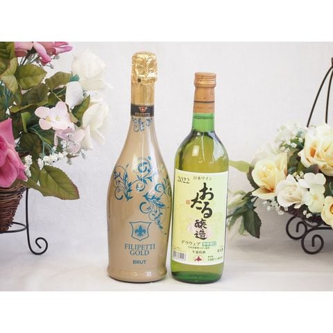 辛口スプマンテスパークリングワインと国産ワインセット(おたる醸造 デラウエア 白ワイン やや甘口(北海道)720mlフィリペッティ ゴールド ブリュット (イタリア) 750ml