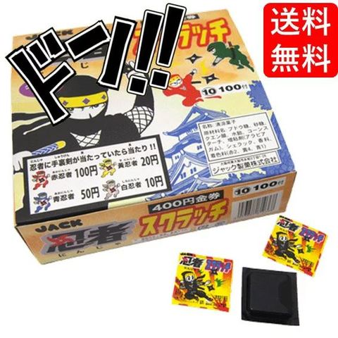忍者スクラッチ 100個 ジャック製菓 ニンジャスクラッチ 金券 当たりくじ 仕掛け 子供も大人も遊んで楽しめる チョコ グミ ミンツ 当たり付き 面白い おすすめ 遊び ゲーム ドキドキ 景品 子供会 子ども会 プレゼント