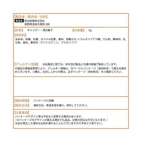 砂糖(国内製造)、水あめ、乳糖、でん粉/酸味料、乳化剤、香料、着色料(クチナシ、アントシアニン、フラボノイド)、炭酸ガス