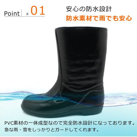 革のような風合いに仕上げたアッパーとソールに継ぎ目のない一体成型ブーツ(長靴)