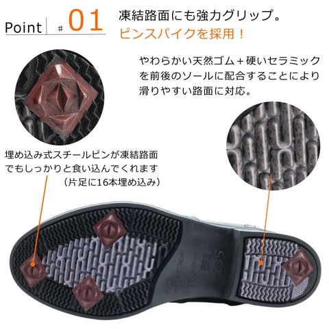 凍結路面でもピンスパイクがしっかり食い込み安心して歩けるブーツです。