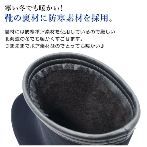 裏地には防寒ボア素材をつま先まで使用しているため厳しい寒さでも暖かくすごせます。