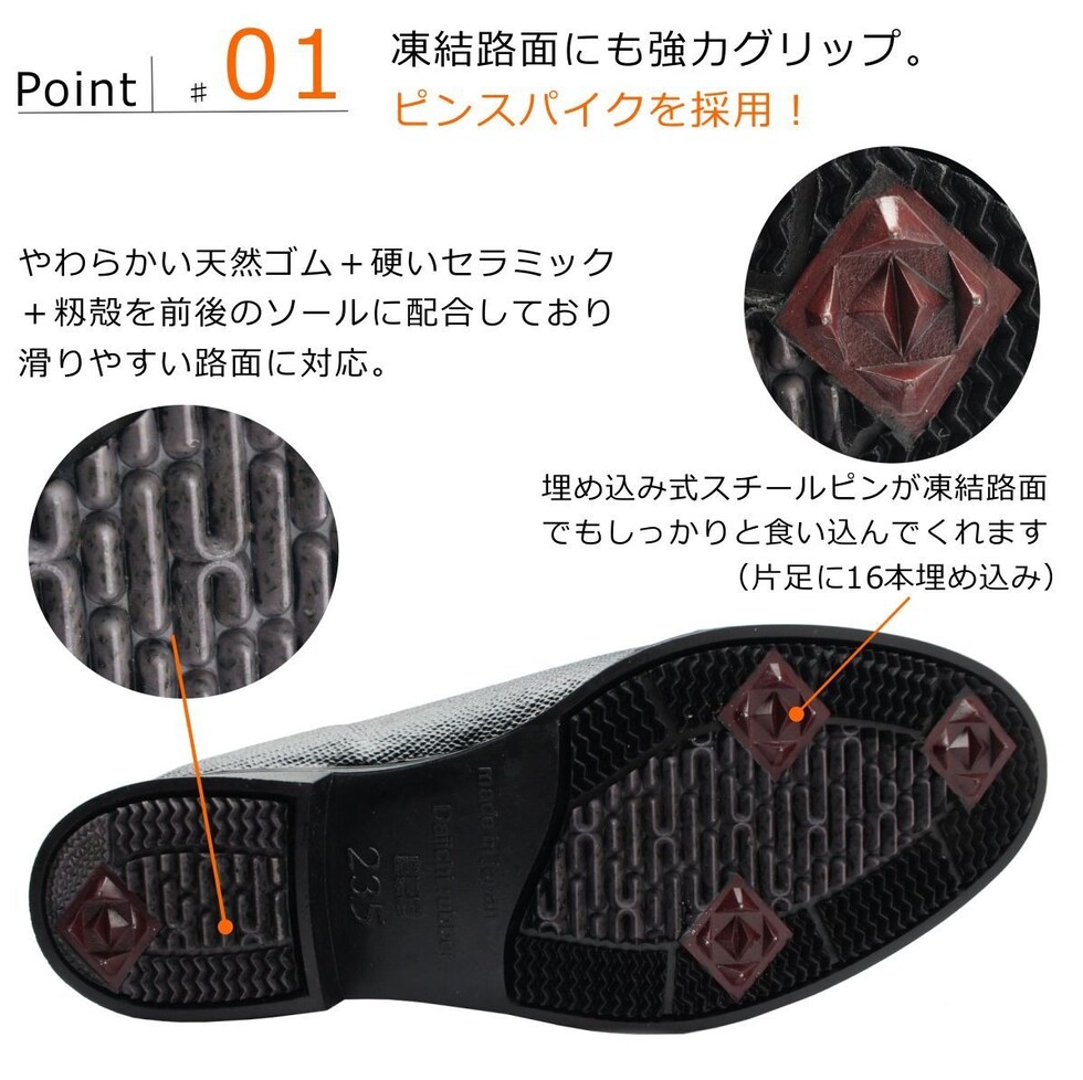 ソールには雪道・凍結した路面でも滑りにくい硬いセラミック+籾殻+ピンスパイクが埋め込まれ、氷道にしっかりと食い込み安心して歩くことができます。