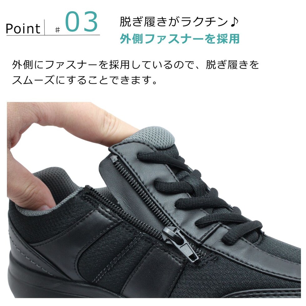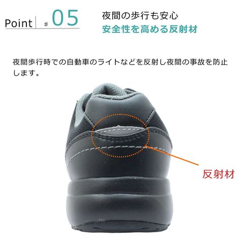 また、脱ぎ履きが簡単なファスナー付きで、夜間歩行時の安全性を向上させる反射材も付いています。