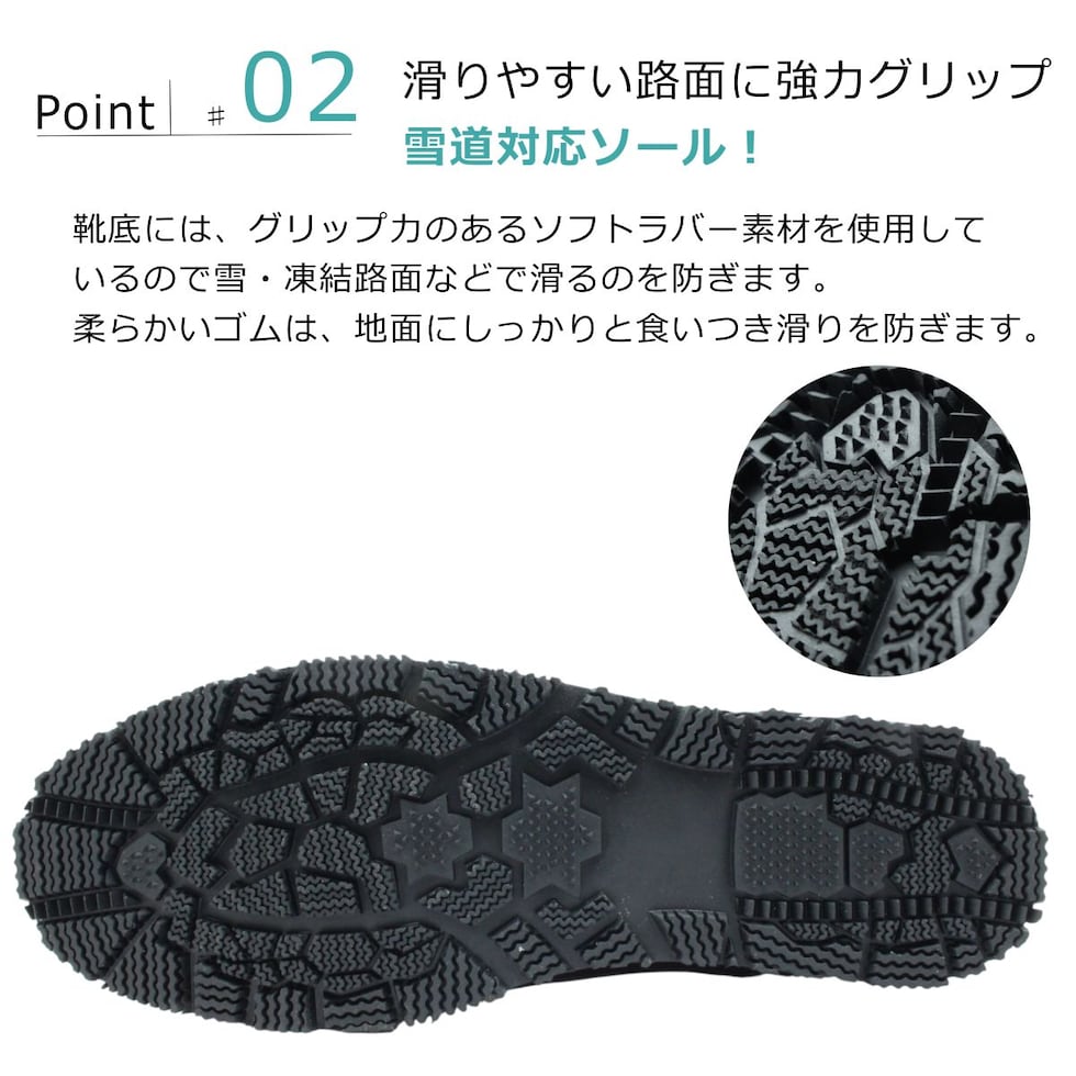 氷点下でも硬くなりにくい柔らかなゴム素材を使用し、地面にしっかりと喰いつくことで、雪道や凍結路面でも滑りにくく、安定した歩行をサポートします。