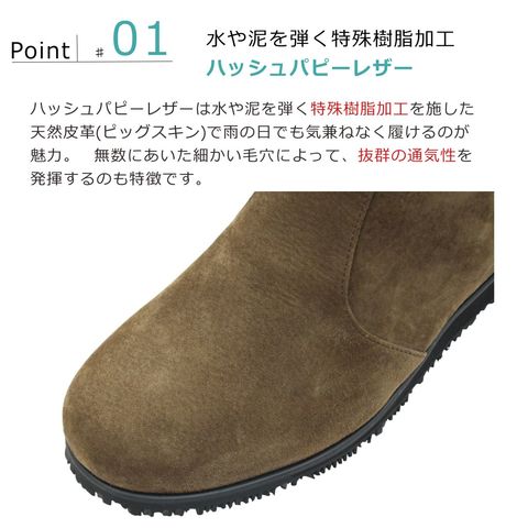 水や泥を弾く特殊樹脂加工を施した天然皮革(ピッグスキン)で、雨や雪の日でも気兼ねなく履けるのが魅力です。