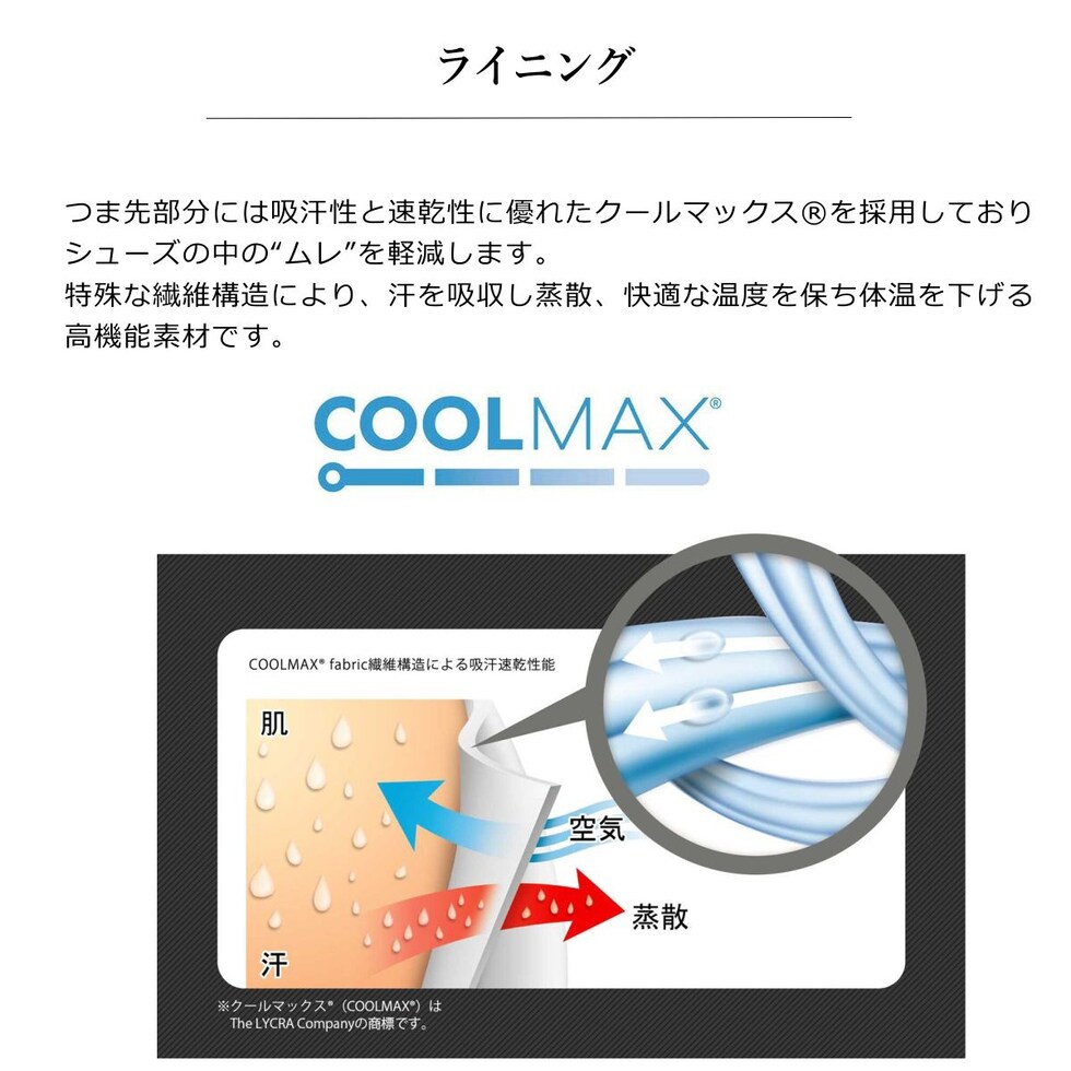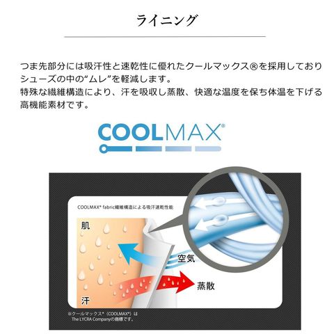 ・屈曲性に優れた特性を有し、ライニングにクールマックスを採用し、靴内環境にも配慮。さらっとした感触で、ベタ付き感を低減