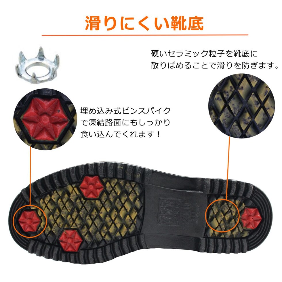 ソールには雪道・凍結した路面でも滑りにくいセラミック+金属製ピンスパイクが埋め込まれ、氷道にしっかりと食い込み安心して歩くことができます。