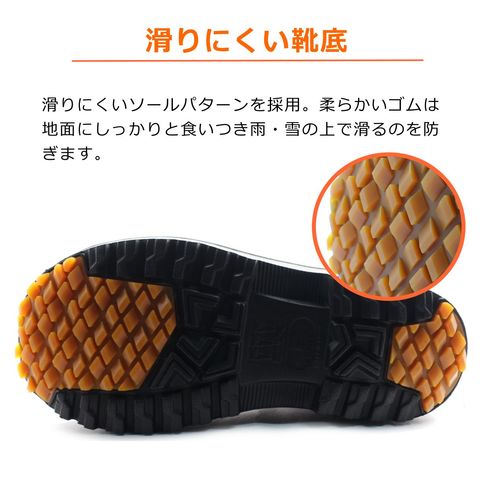 靴底には溝のしっかり入った防滑ラバーソールでグリップ性がよく、雨や雪に効果を発揮してくれます。
