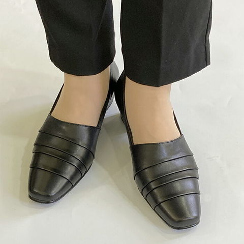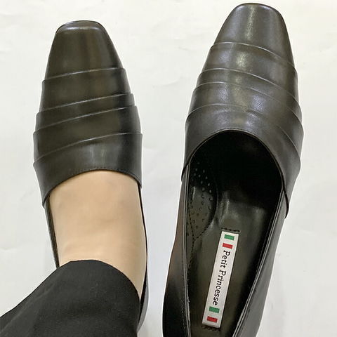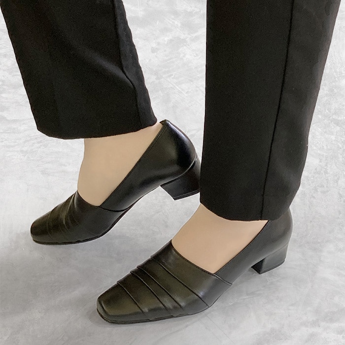 キメ細かい本革を丁寧に折り込んで作られた上品なデザインのスクエアトゥパンプスです。