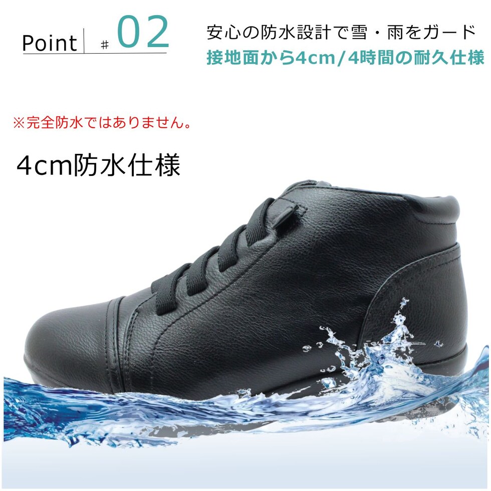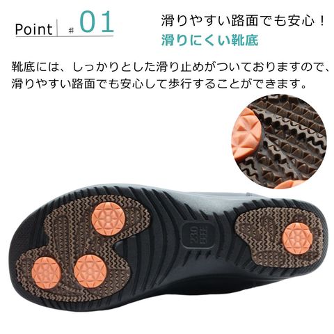 靴底にはしっかりとした滑り止めがついており、雨・雪など濡れた路面でも滑りにくくなっております。(ピンスパイクは入っていないモデルになります。)